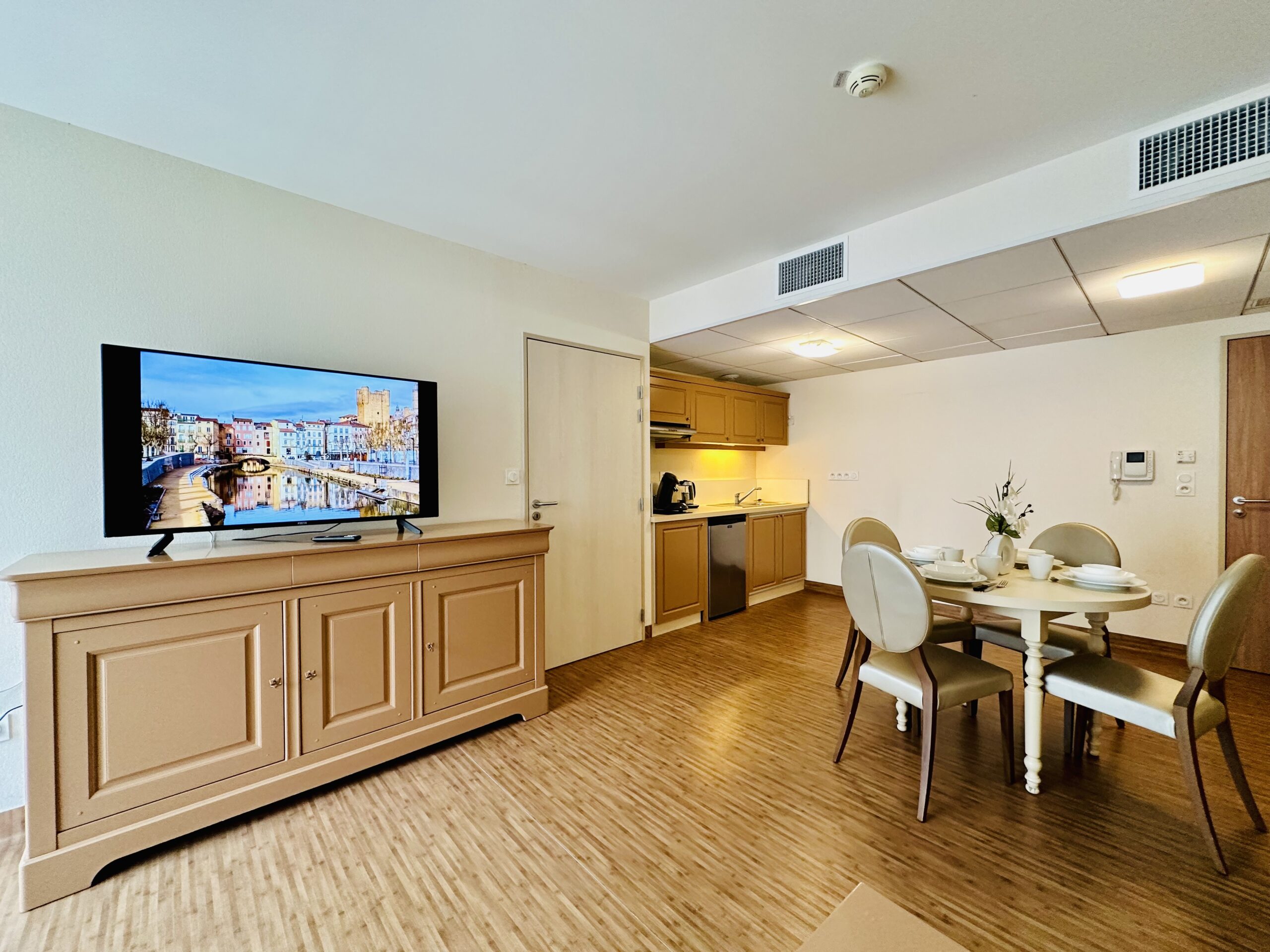 Chaque appartement senior Narbonne reflète un véritable art de vivre : des espaces spacieux et fonctionnels, une décoration sobre et élégante, et une ouverture sur la lumière naturelle typique du sud.